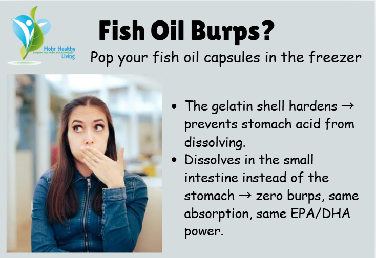 Hate the fishy burps? 😣 Pop your fish oil capsules in the freezer (just like we do with castor oil caps for parasite cleanses). Why it